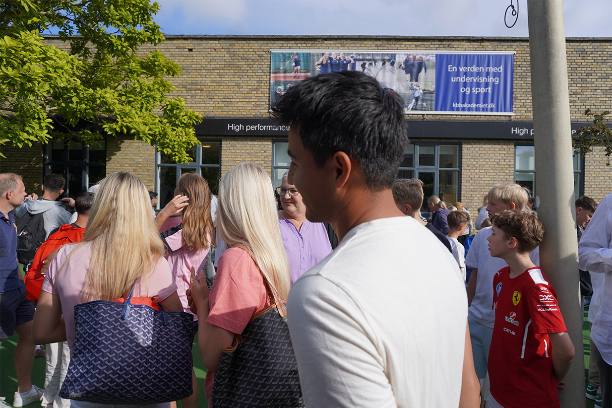 Ved ankomsten i skolens have blev der hilst og krammet, og der var mange smil til såvel nye og gamle elever som til lærere og akademitrænere.